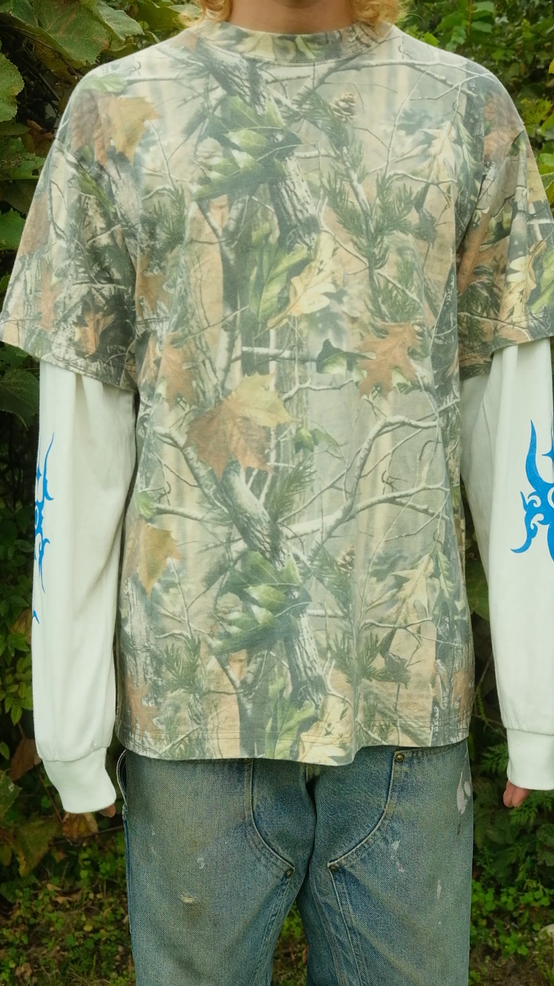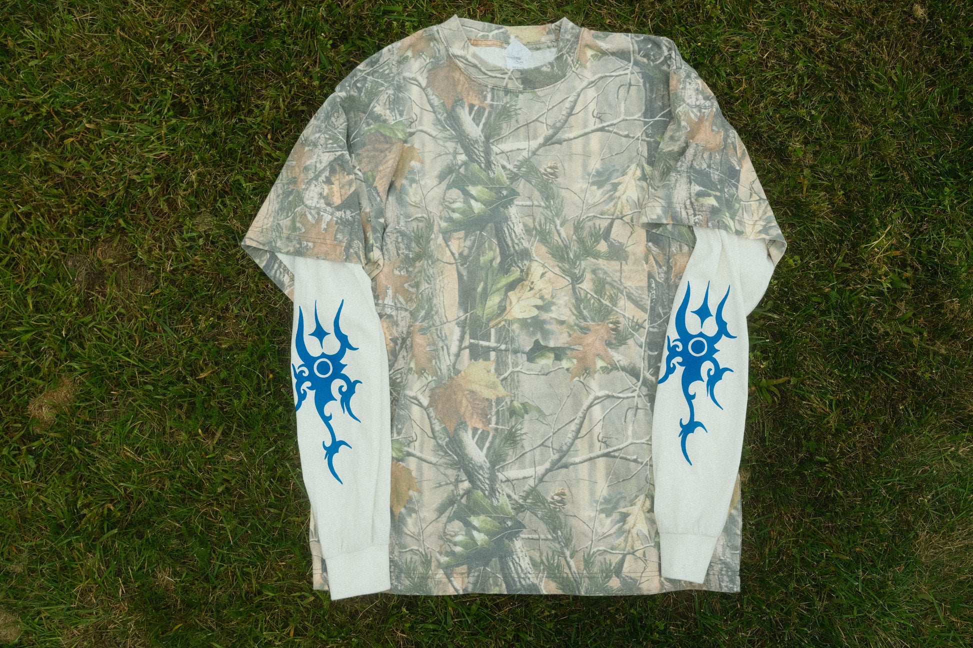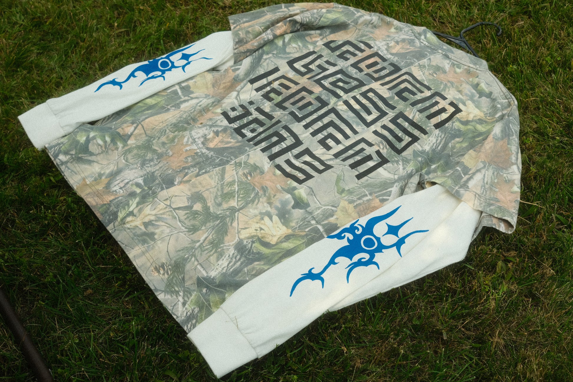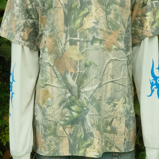 Screen printed by hand on an oversized box vintage camo 2fer long sleeve by Cotton Collective.